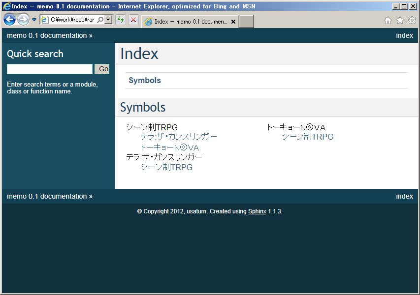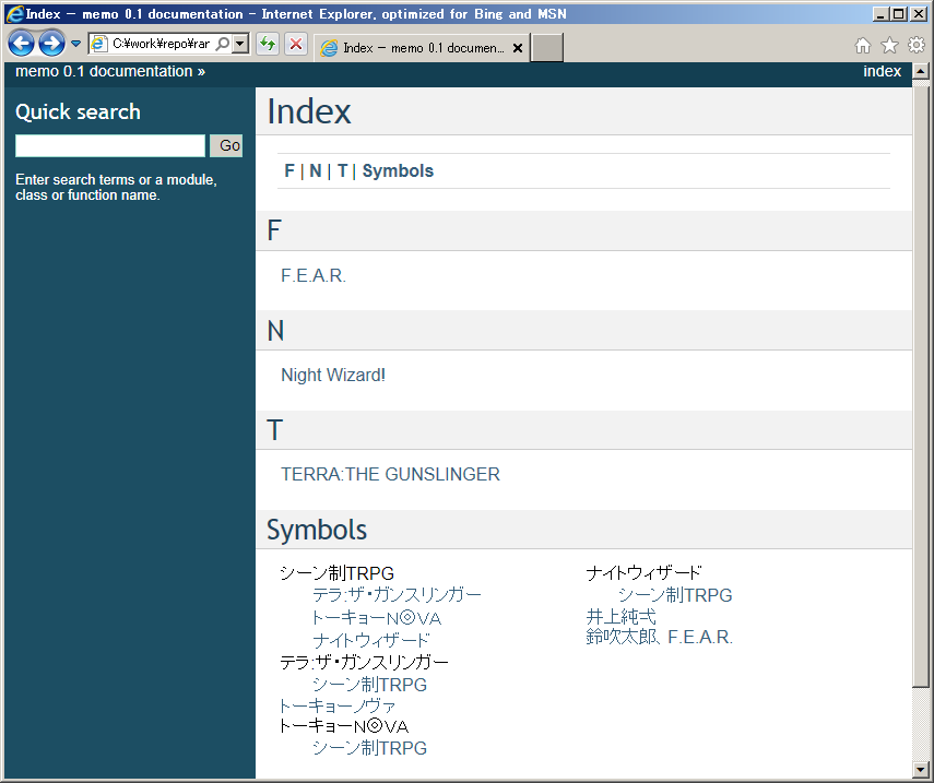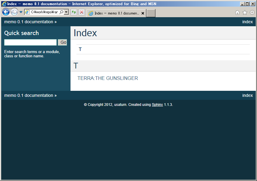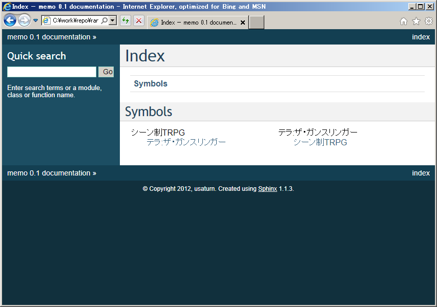 一般の技術書等には、大抵最後の方に索引が記載されていると思います。Sphinxでもドキュメントに