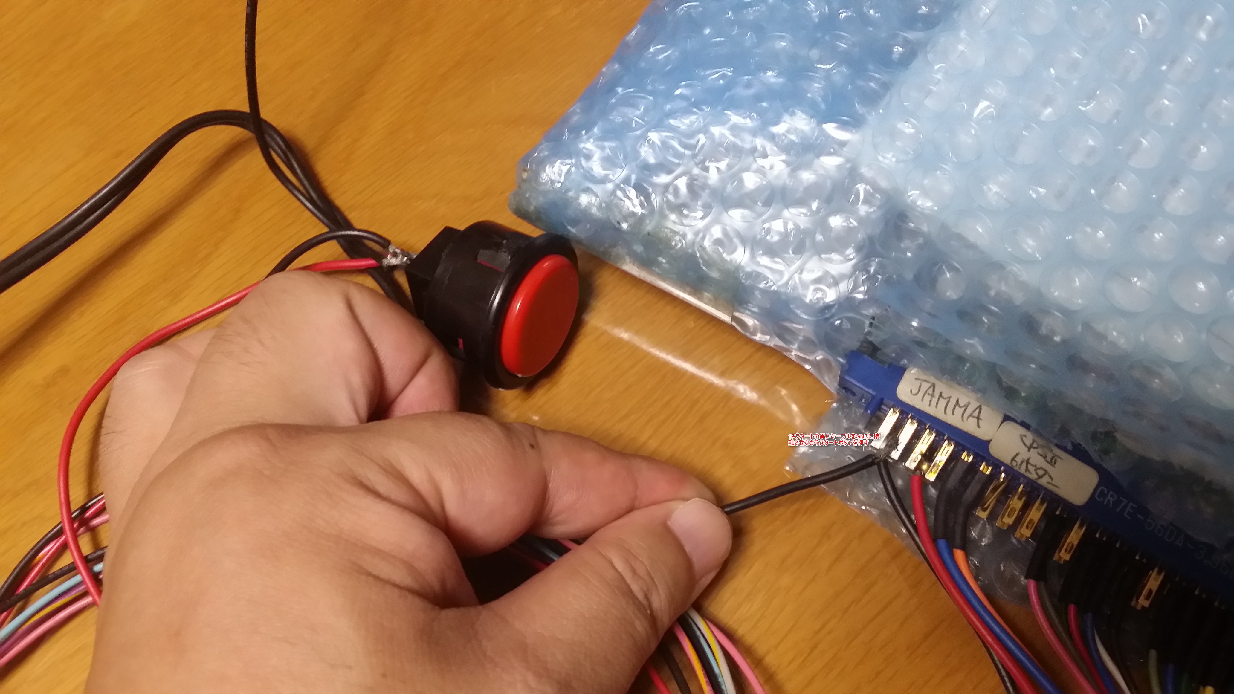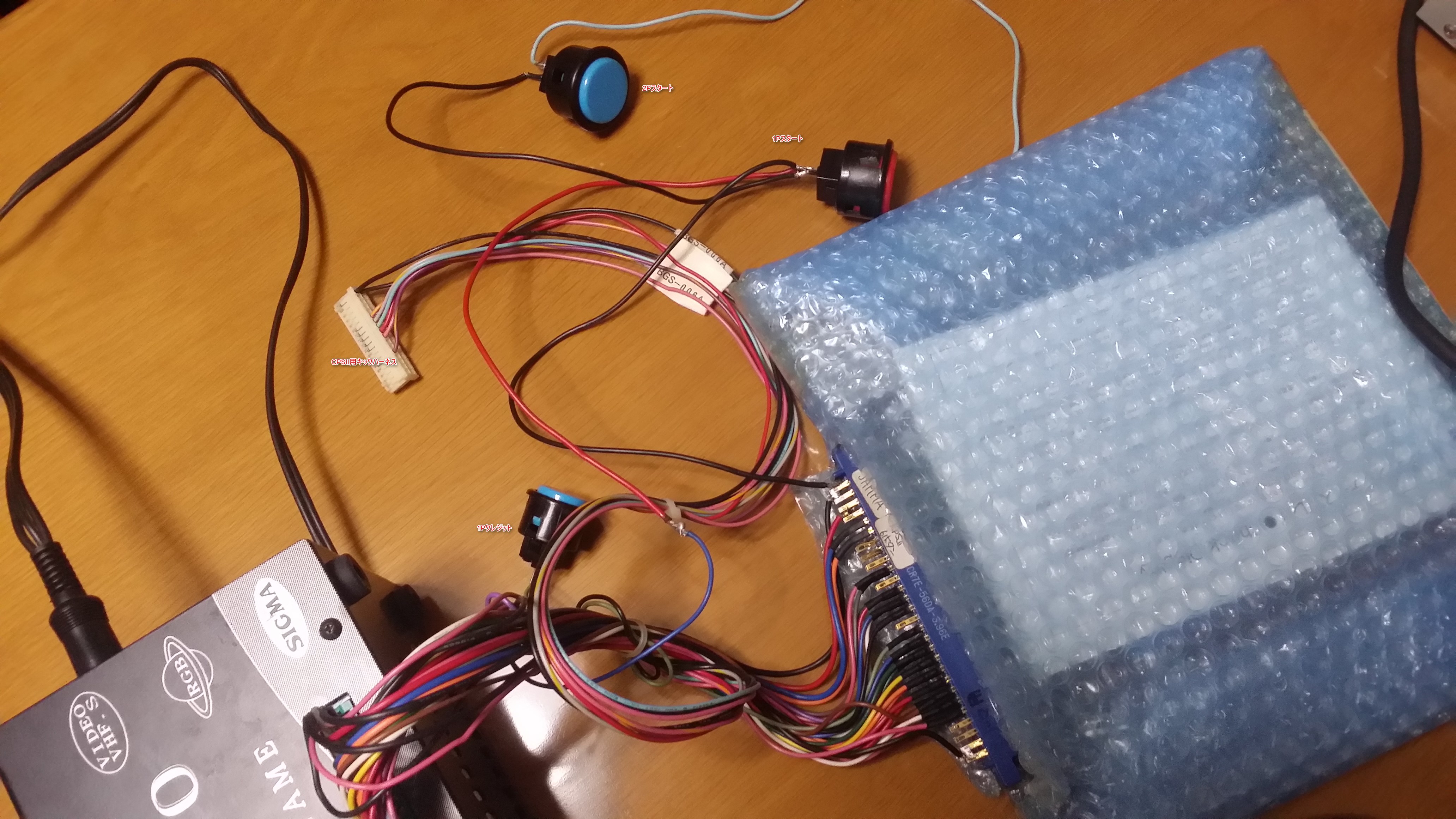 ごめんなさい、1Pスタートボタンのケーブルが外れてしまったので、1Pスタートについている黒いケーブルの先を基板側の JAMMA ハーネスの GND に接触させながらスタートボタンを押してください。 本来ならちゃんと半田付けをしなおすところなのですが・・・